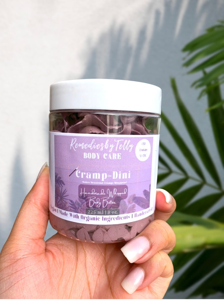 Cramp~Dini Plus body butter is a thick and rich luxurious cream. Crafted with a combination of organic components and enriched herbal oils to target discomfort, Increases circulation, and release tension. Also Infused with the calming scent of cinnamon and lavender.